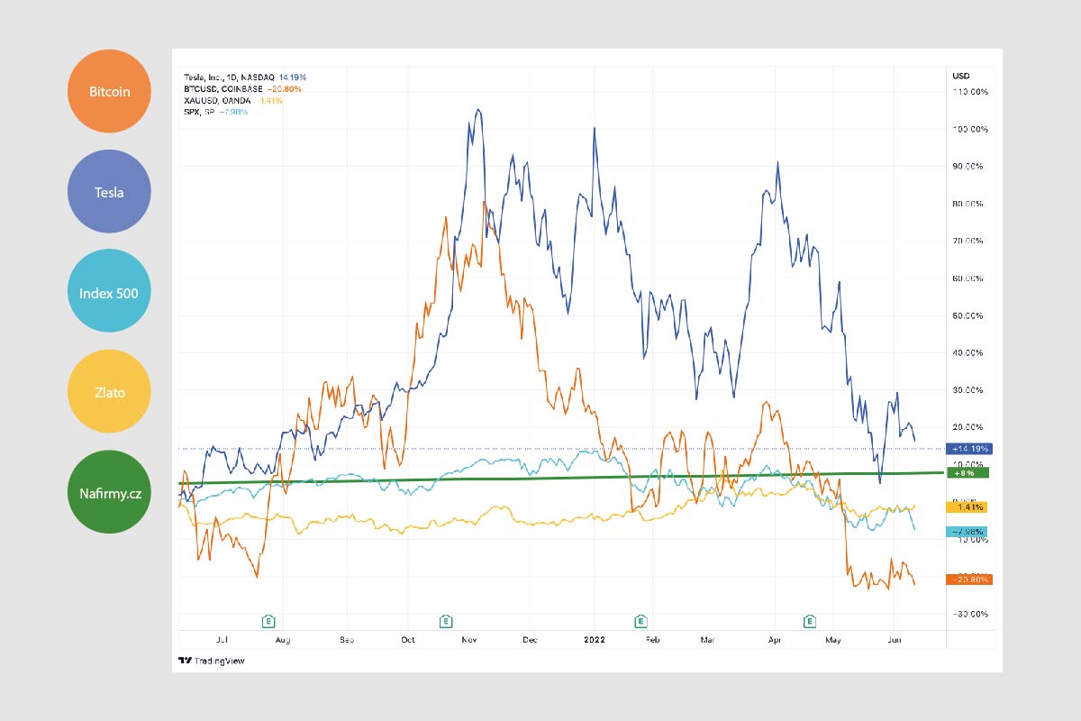 V grafu vidíte výkyvy nejoblíbenějších investičních položek – akcie, zlato i kryptoměny se průběžně potýkají s propady. Často i zásadními. Z grafu je patrné, že výnos při investici do projektů na portálu Nafirmy nikdy nebude extrémně vysoký, ale na druhou stranu se zničehonic nepropadne. Pokud si navíc vybudujete diverzifikované portfolio, jistota zisku se přes Nafirmy ještě zvýší. Riziko, že skončí třeba 10 firem naráz, je opravdu minimální.